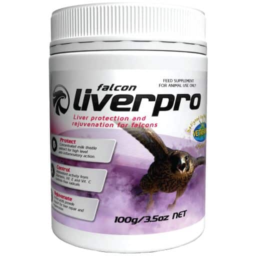 Falcon Liverpro was formulated by avian veterinarians to support liver health. Recommended for use in hunting Falcons recovering from stress, antibiotics and liver disease/damage.