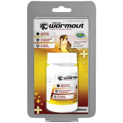 Falcon Wormout Tablets were developed by avian veterinarians for the treatment and prevention of all intestinal worms in Falcons. Contains Oxfendazole and Praziquantel and is effective against Threadworm (Capillaria spp.), Tapeworm & Roundworm (Ascaridia spp.). Falcon wormout is both safe and highly effective, administered in tablet form to ensure accurate treatment in falcons.