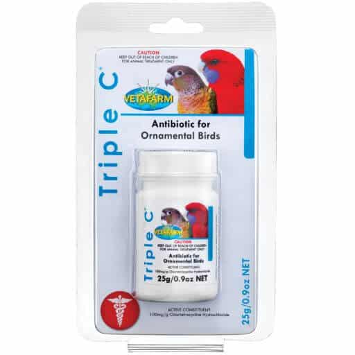 Triple C Antibiotic Powder will be affected by the presence of calcium in the diet. During treatment remove all sources of calcium including supplements, shell grit and cuttlefish bone.